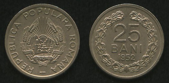 10000 Lej (10000 Лей) 1947Подробнее о монете 5 Lej (5 Лей) 1950Подробнее о монете 1 Lej (1 Лей) 1949Подробнее о монете 25 Bani (25 Баней) 1952Подробнее о монете